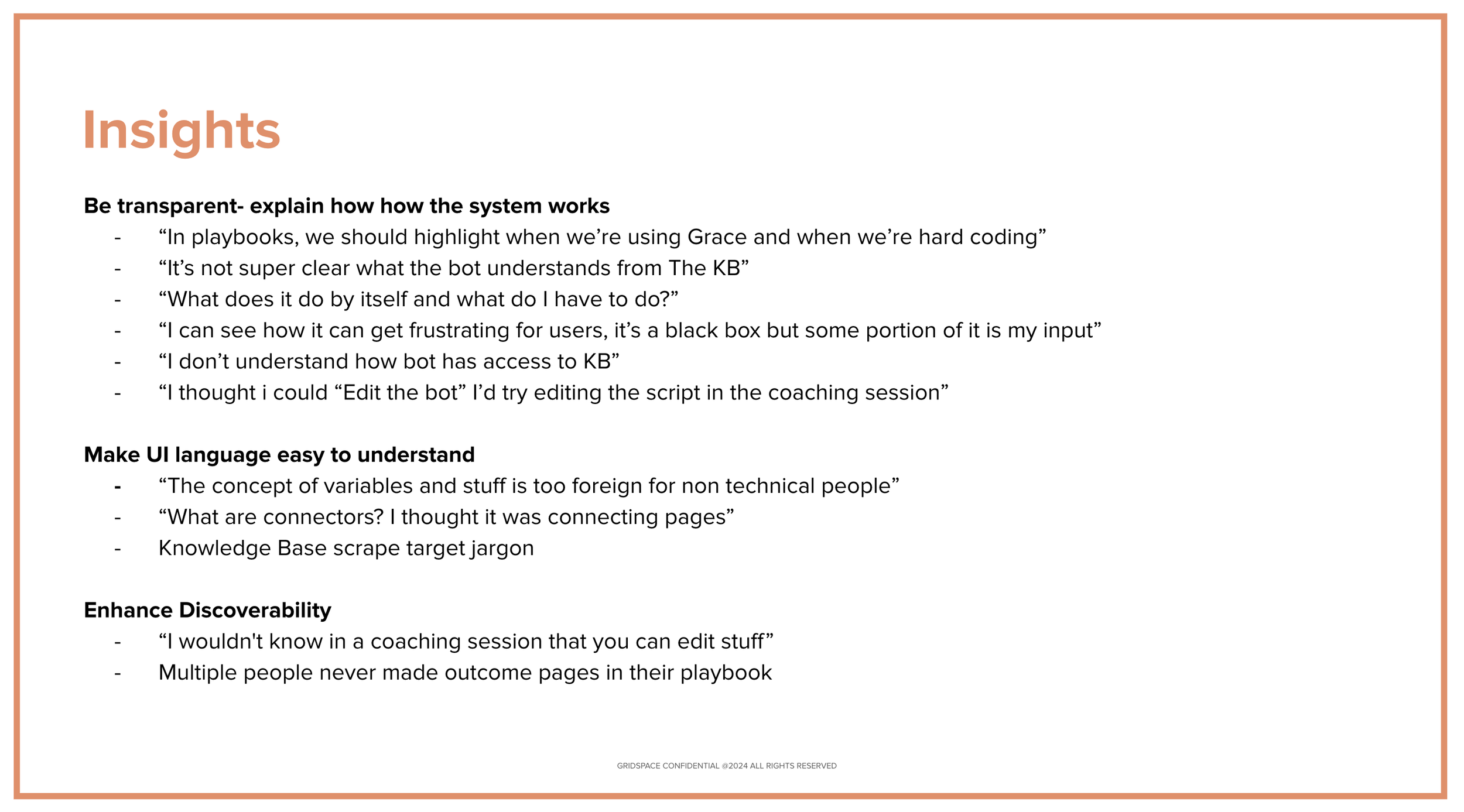 The findings informed a set of UX principles that guided improvements to agent creation and testing workflows.