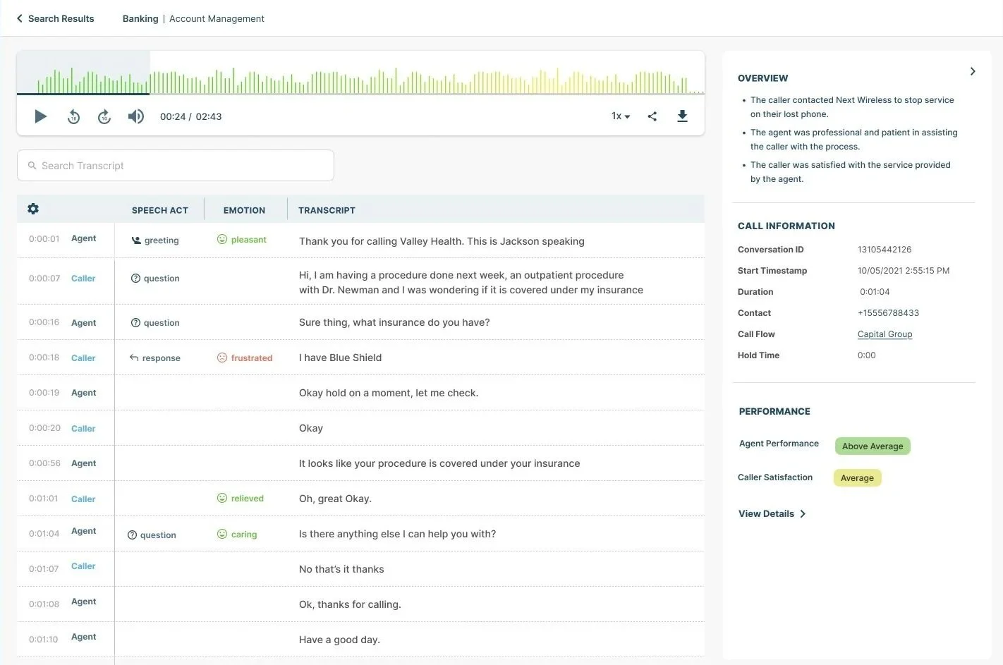 The conversation view was designed around the call transcript and language metrics as a single point of truth for contact center supervisors, quality assurance specialists, and analysts.